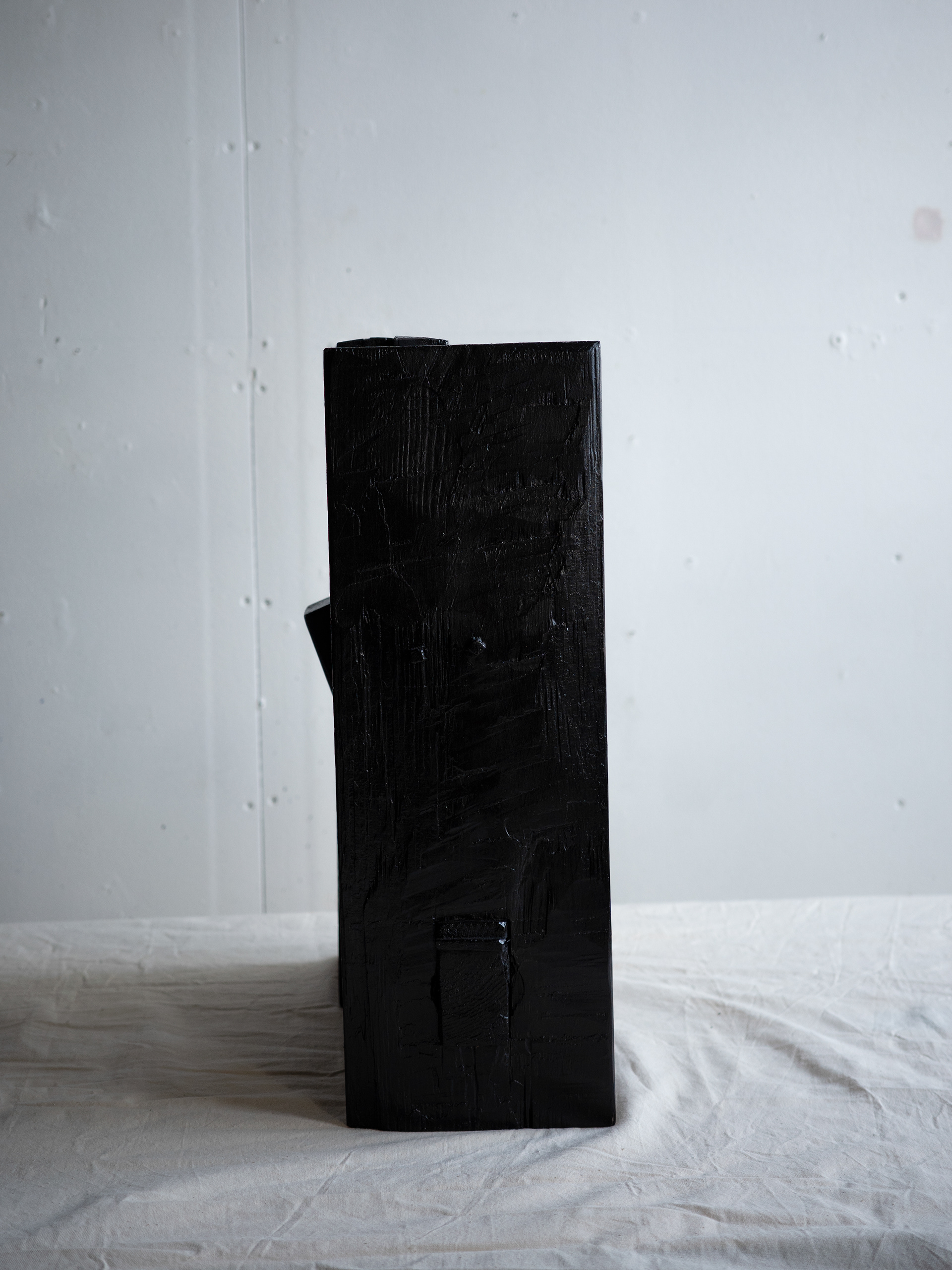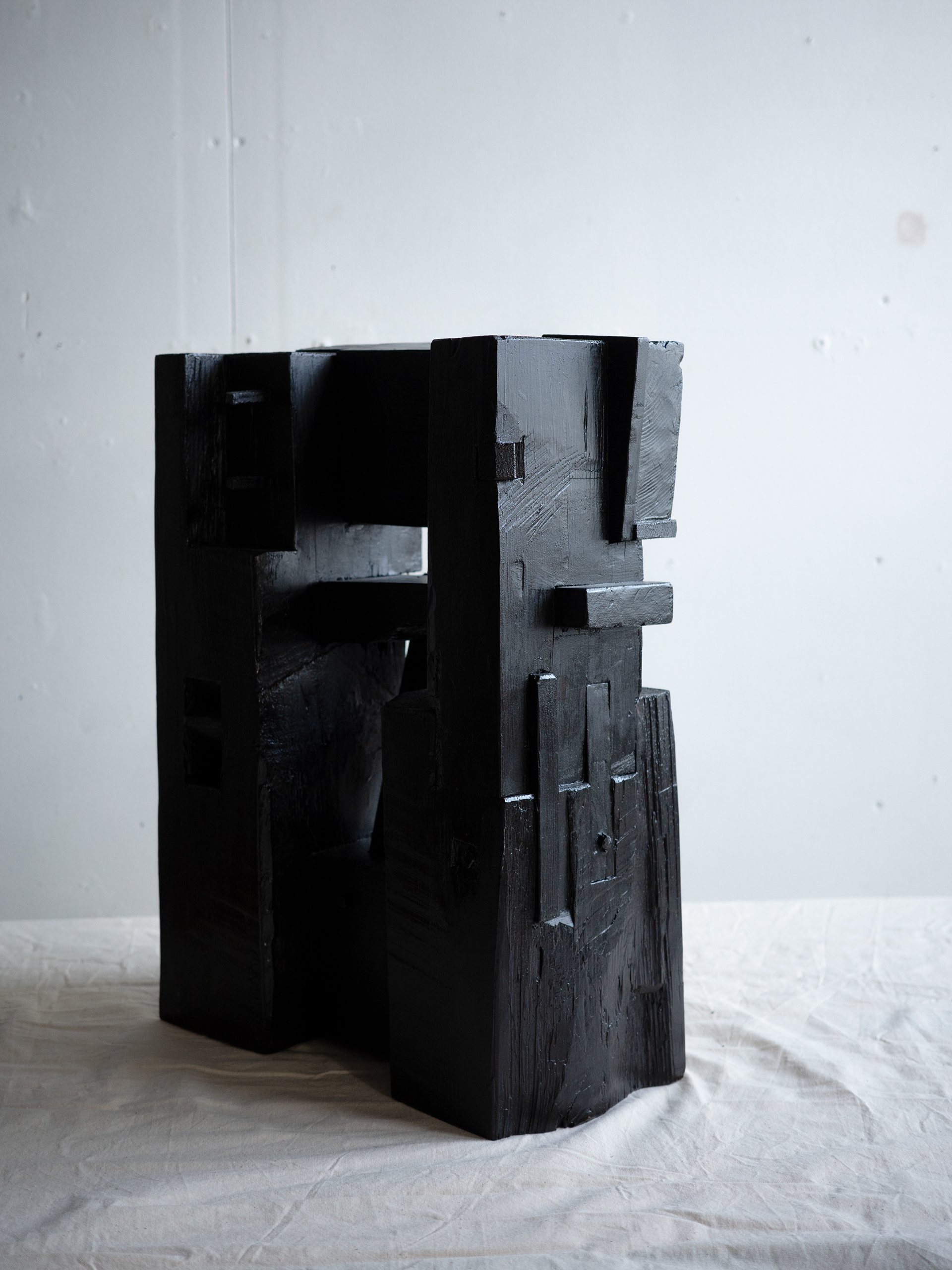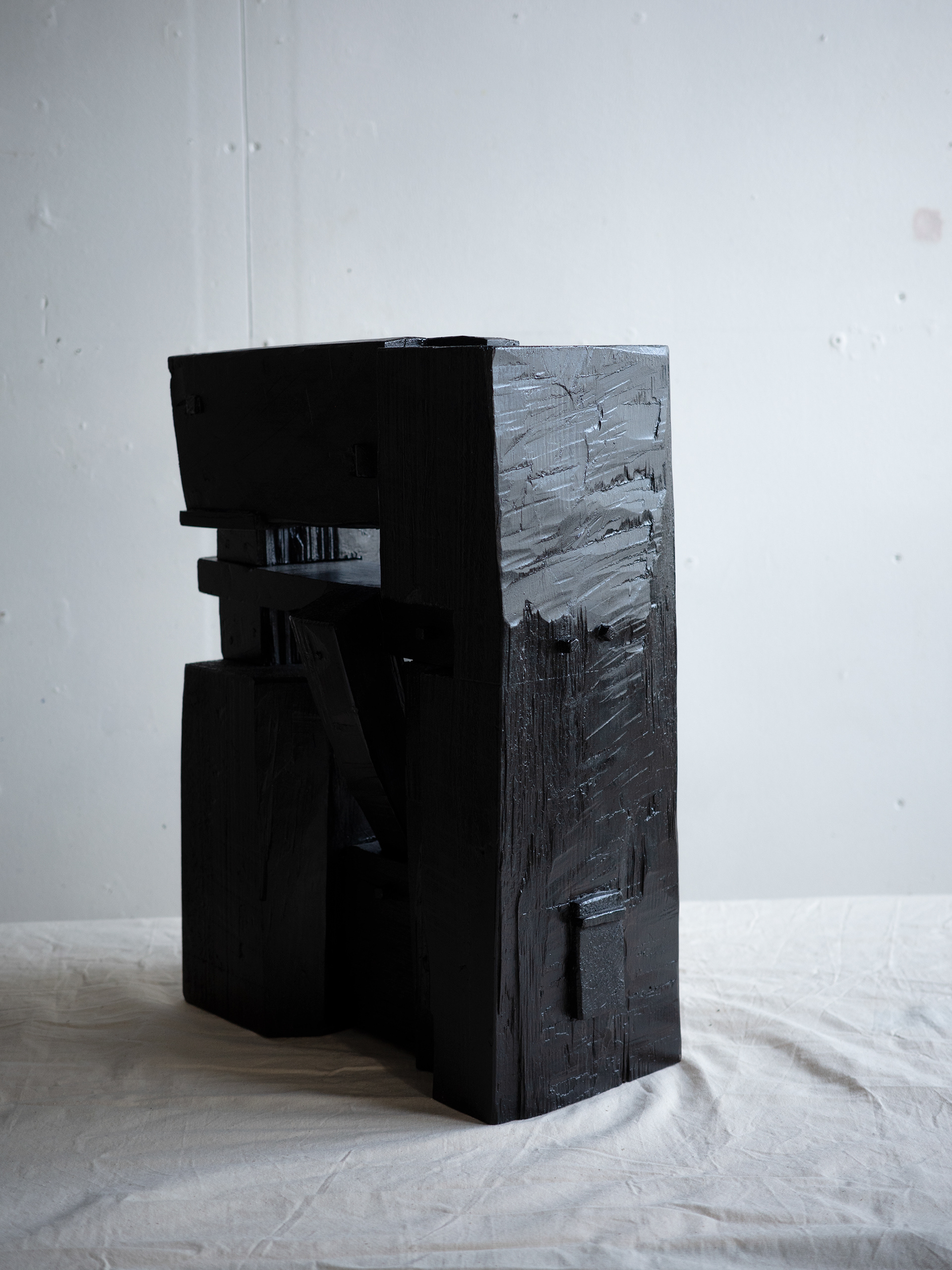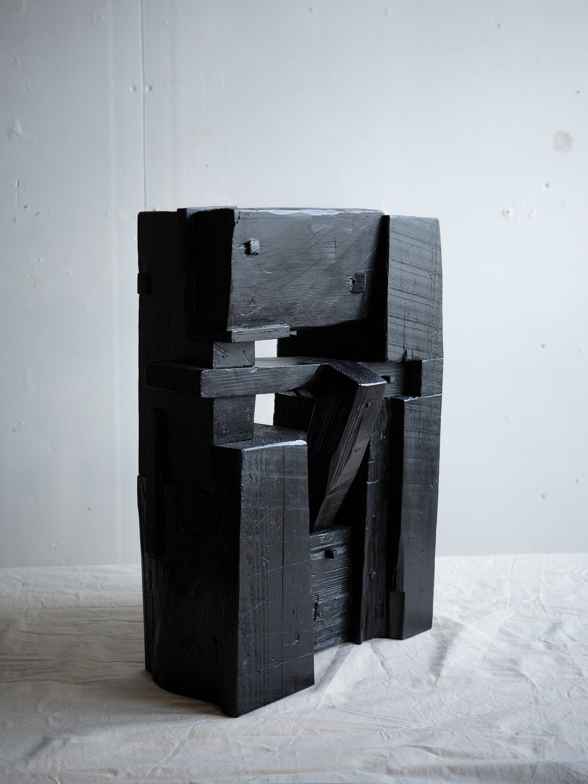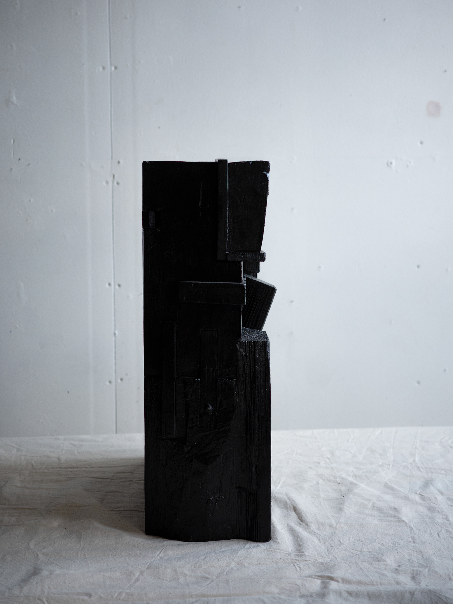 The artwork is a collage and assemblage of multiple small wooden pieces that come together as both an object and a sculpture. Several layers, elevations, recesses, and hollows create a deep three-dimensionality, revealed as light touches the glossy black surfaces and textures. Thematically, the sculpture explores what is left unspoken and untold, how, even within a shared language, much remains unsaid, overlooked, or suspended in between.