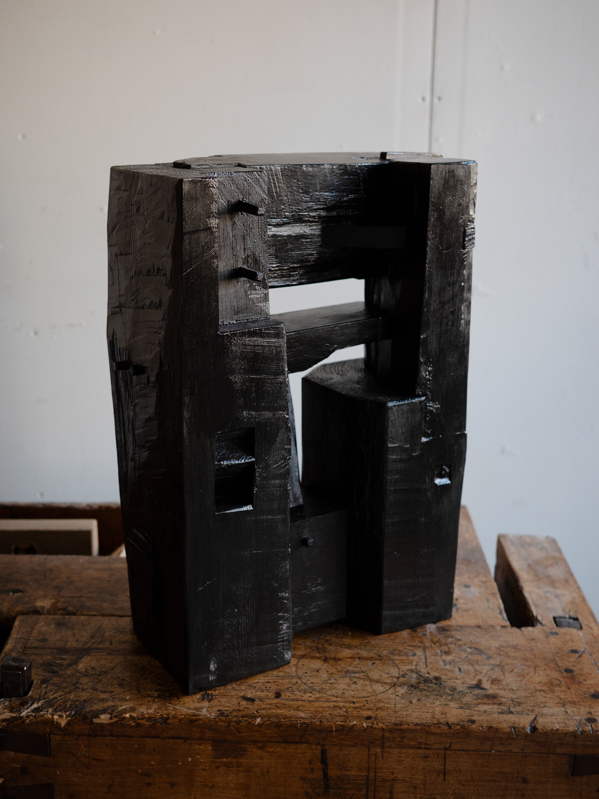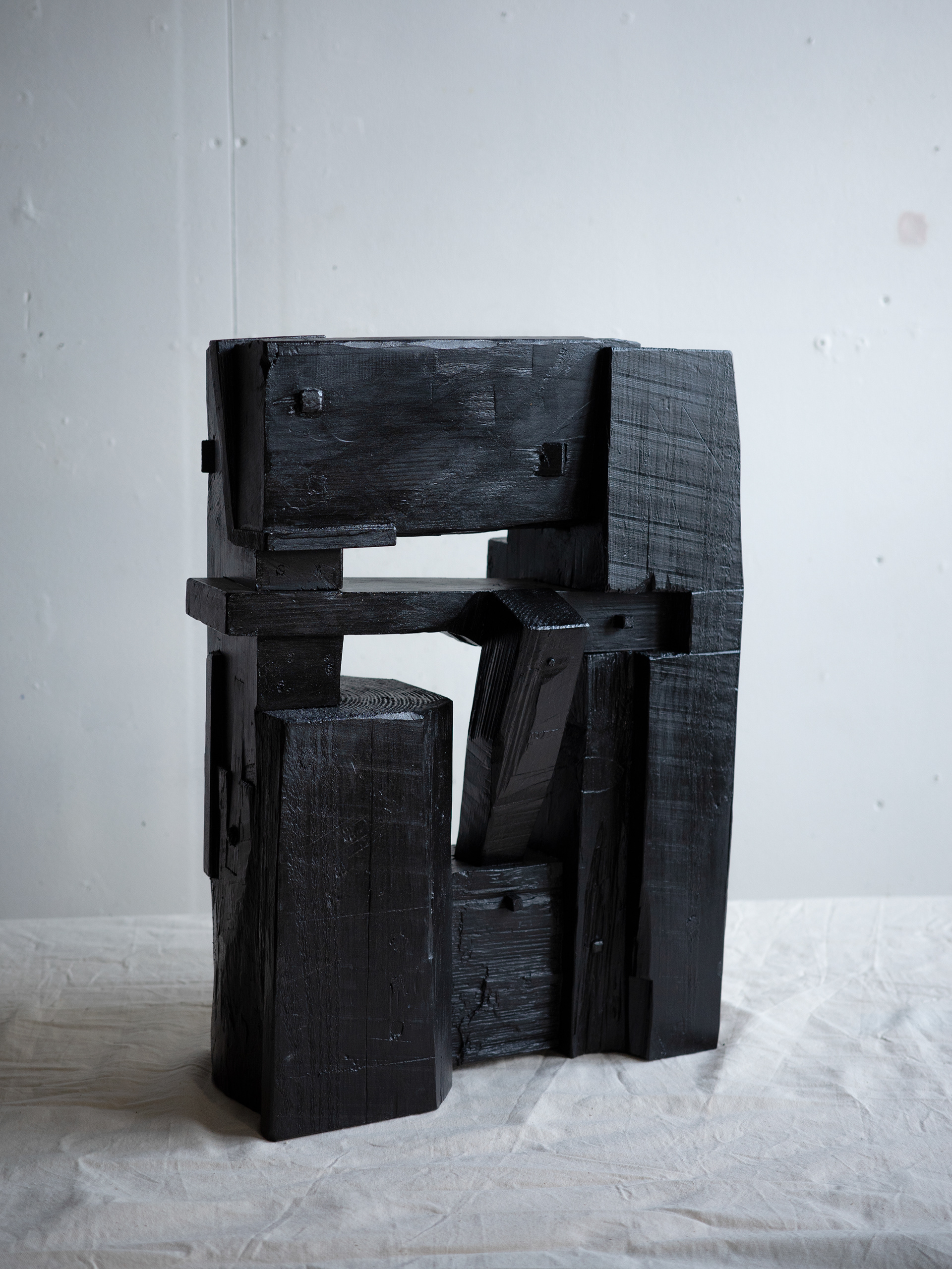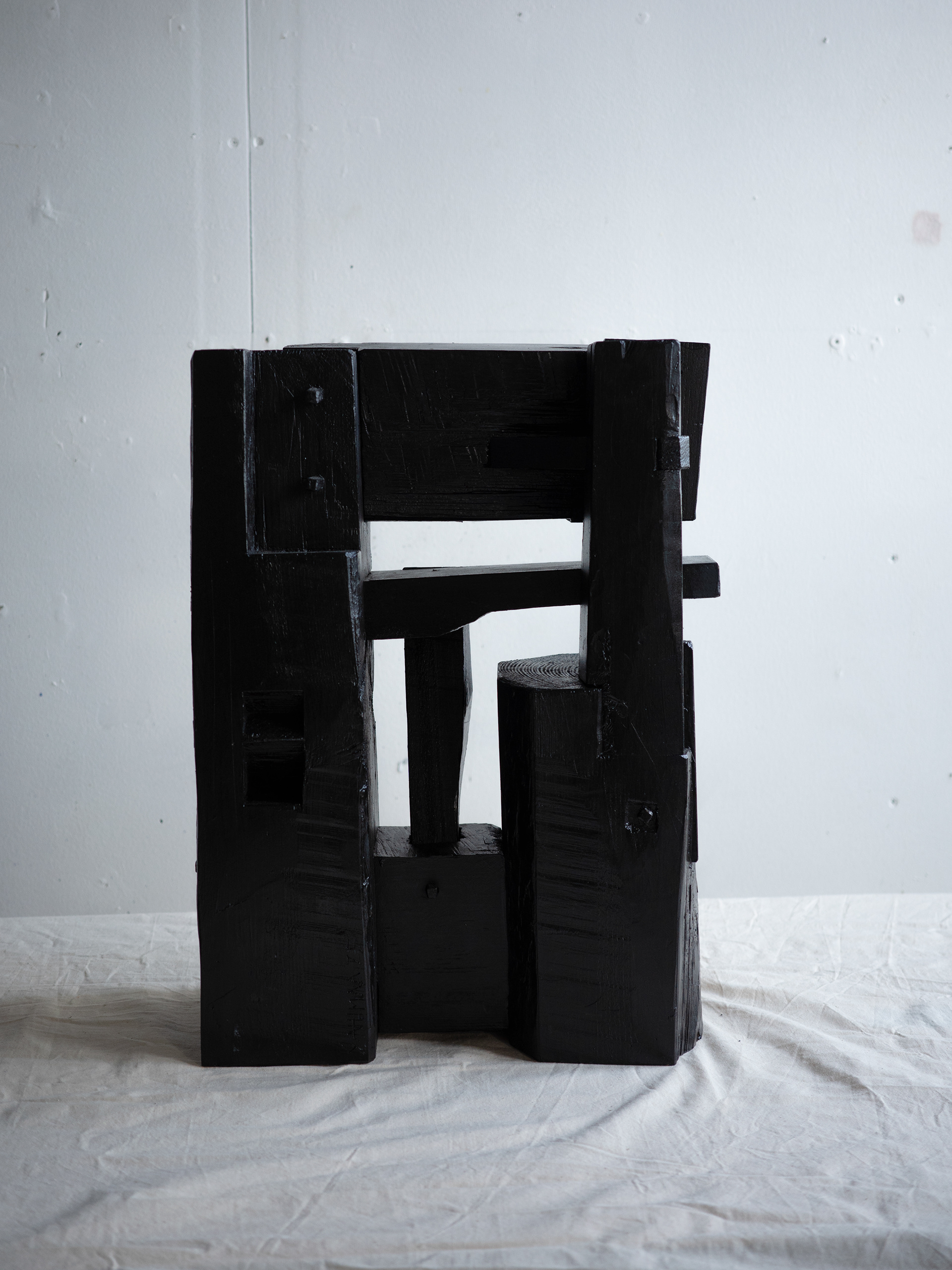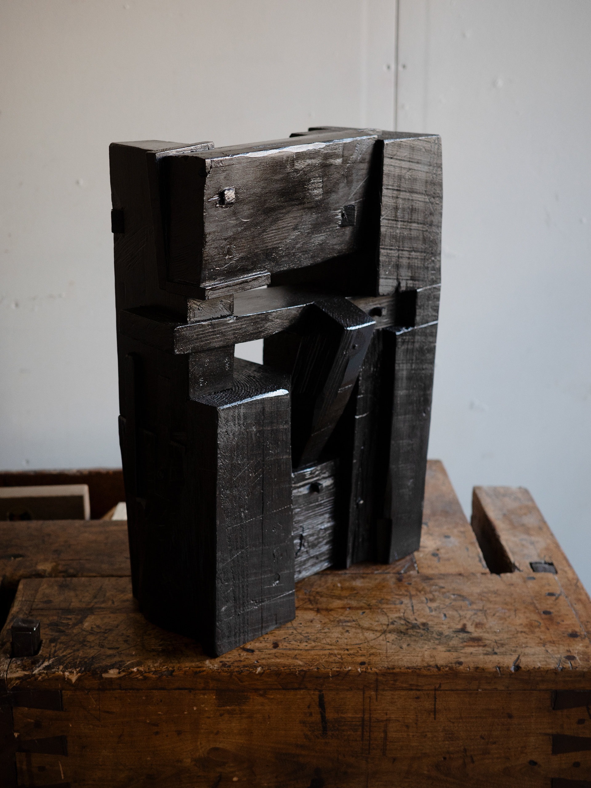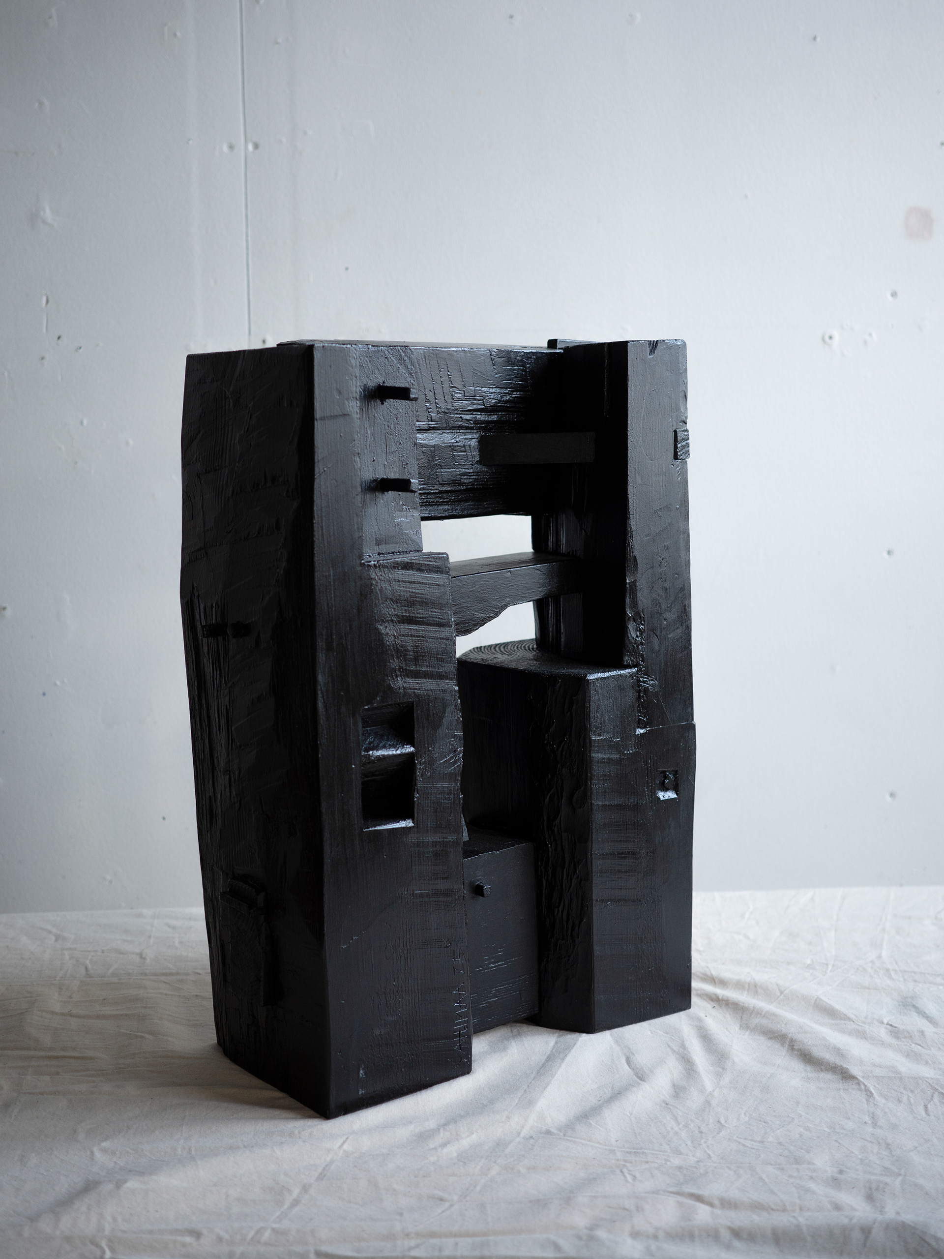 The artwork is a collage and assemblage of multiple small wooden pieces that come together as both an object and a sculpture. Several layers, elevations, recesses, and hollows create a deep three-dimensionality, revealed as light touches the glossy black surfaces and textures. Thematically, the sculpture explores what is left unspoken and untold, how, even within a shared language, much remains unsaid, overlooked, or suspended in between.
