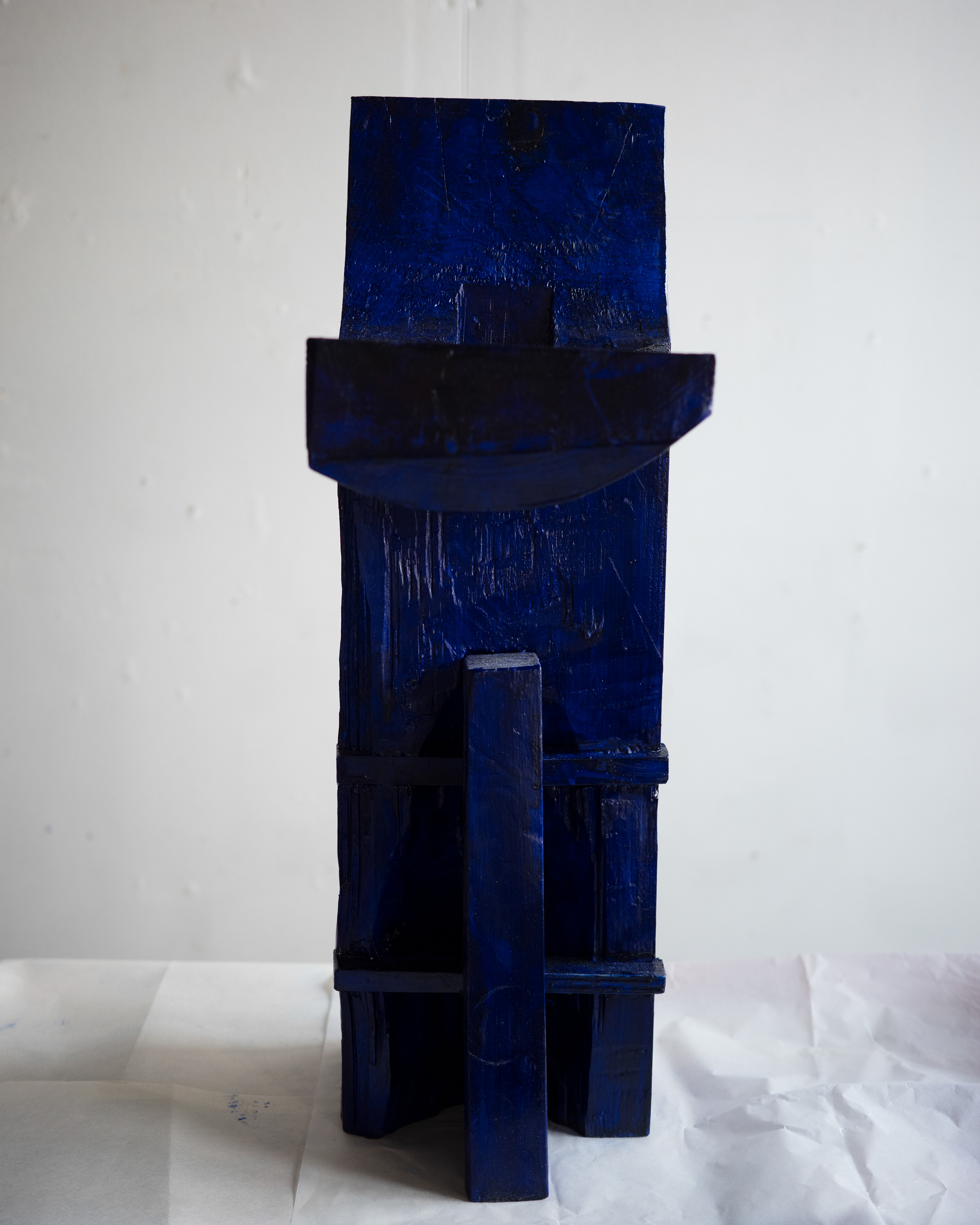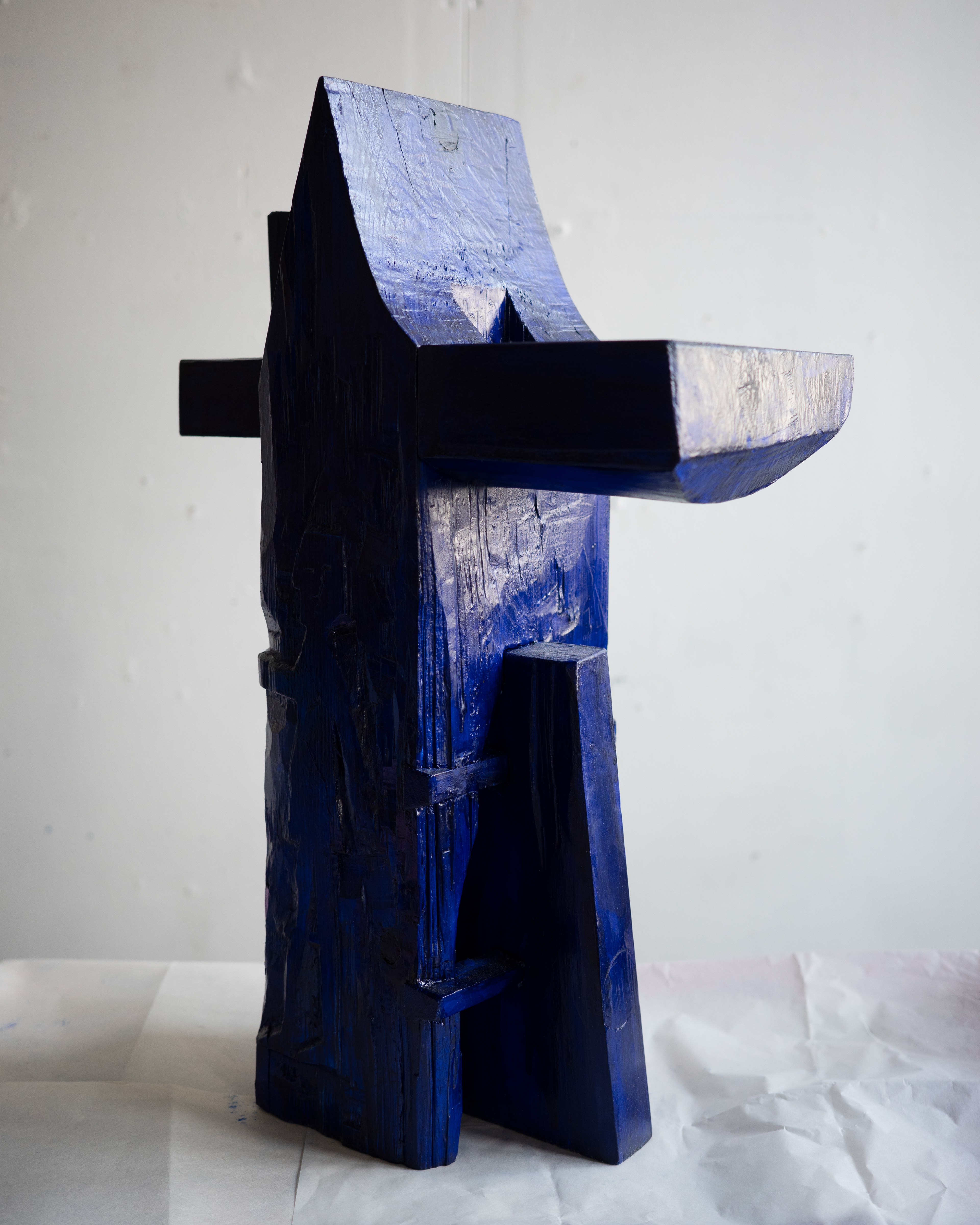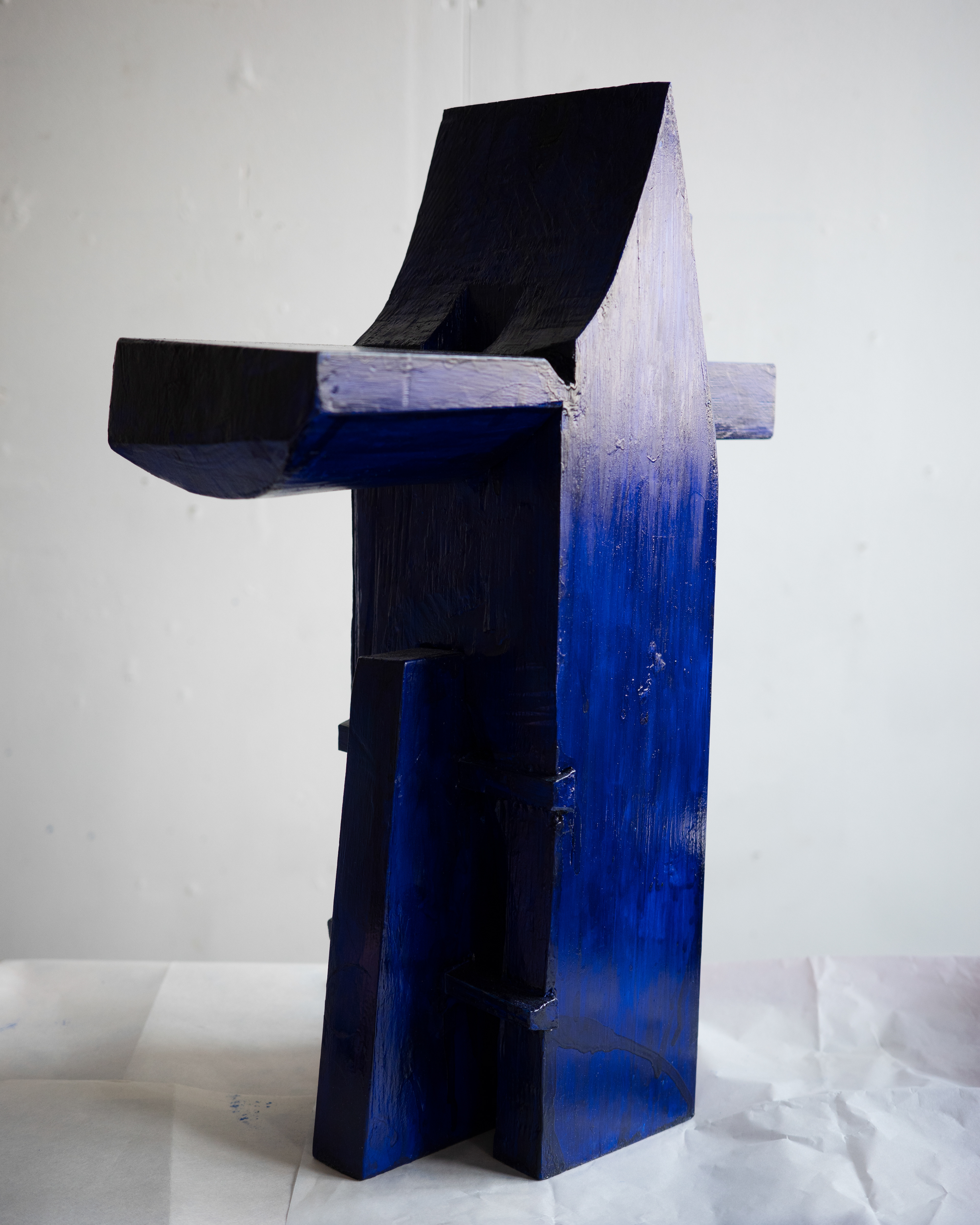 In the artwork, the figure reaches for the wedge that holds the piece that pierces through frame and makes surface, a gesture that might cause the table to collapse. The piece is assembled from multiple parts, combining elements of traditional wooden craft with familiar notions of functional objects.