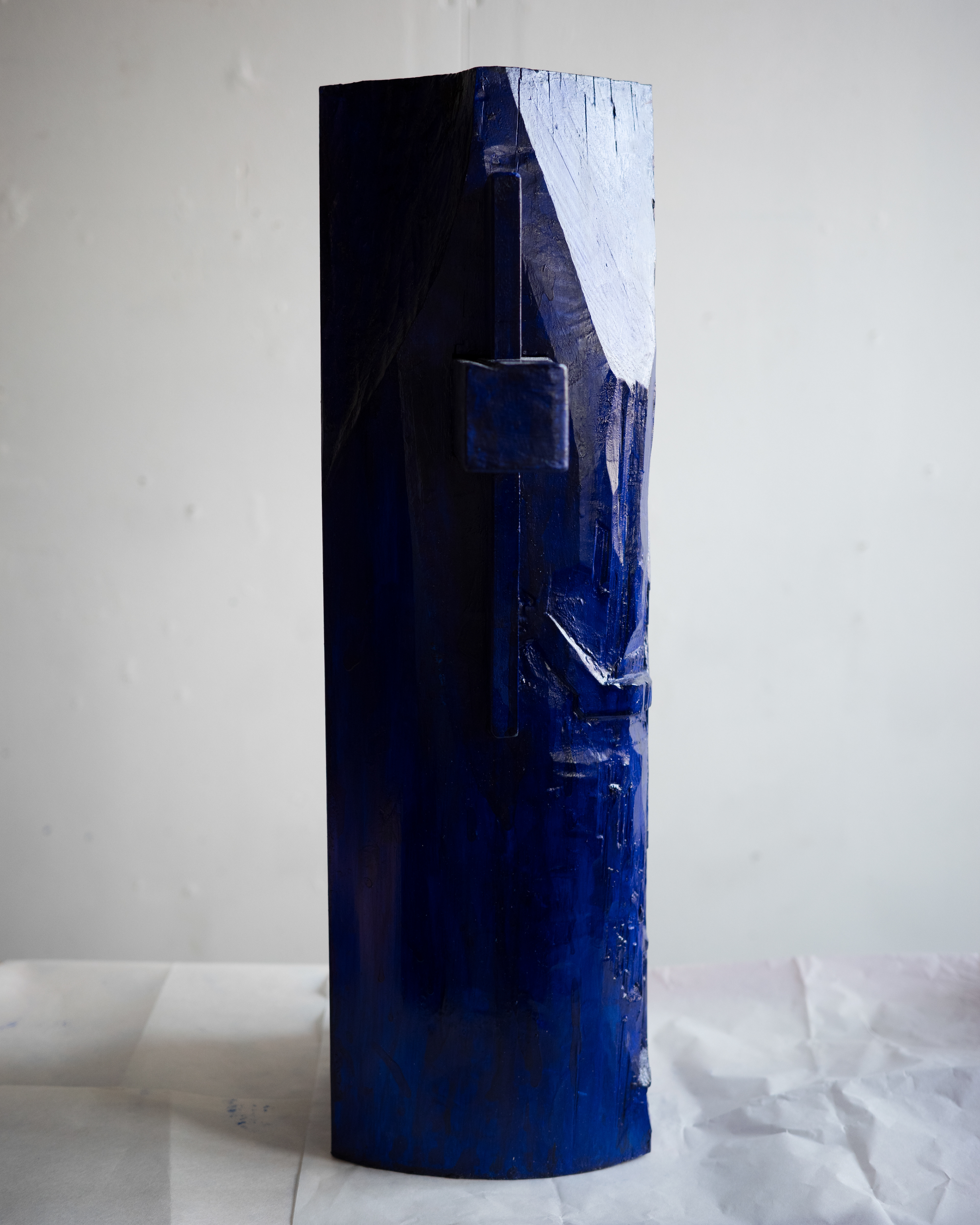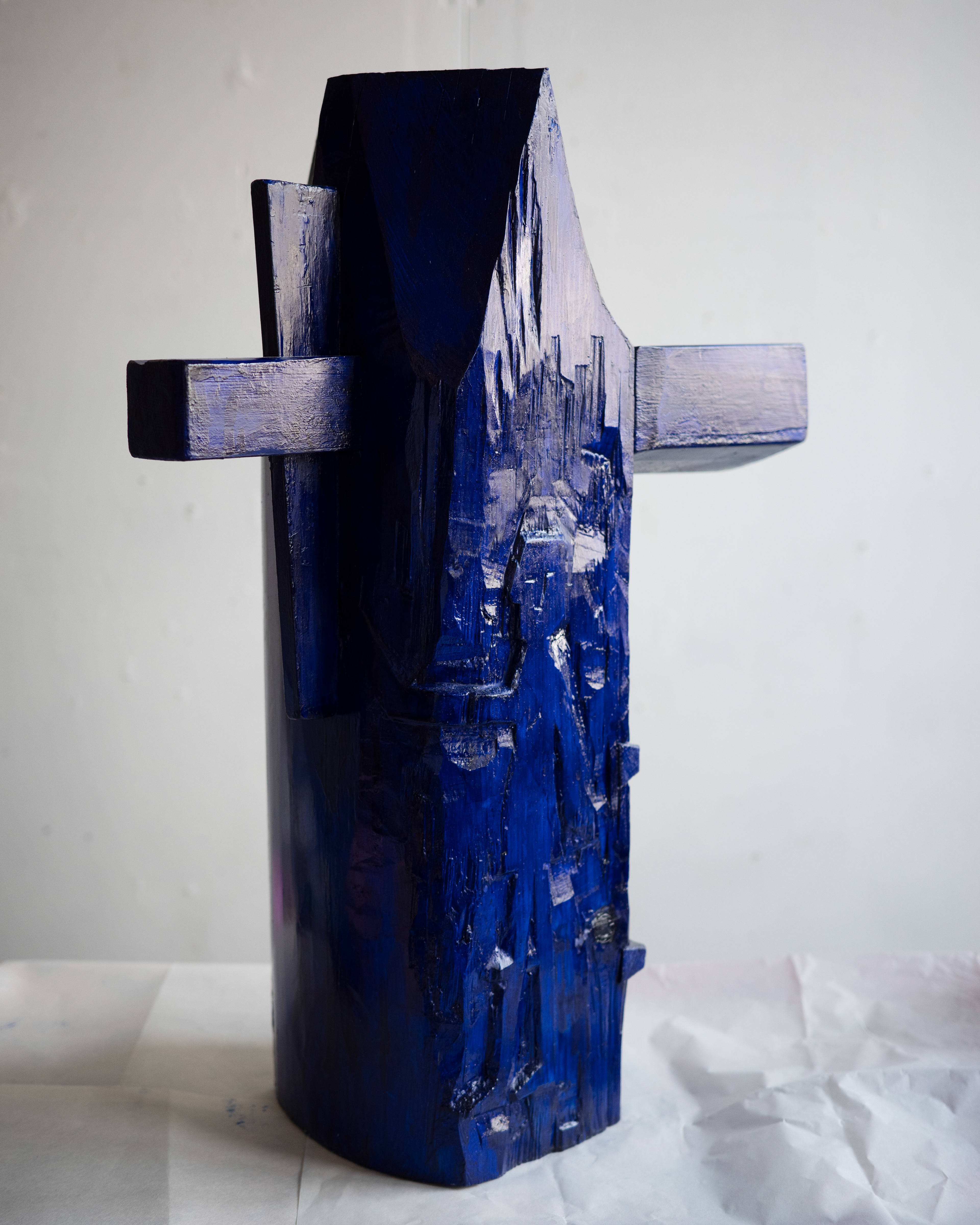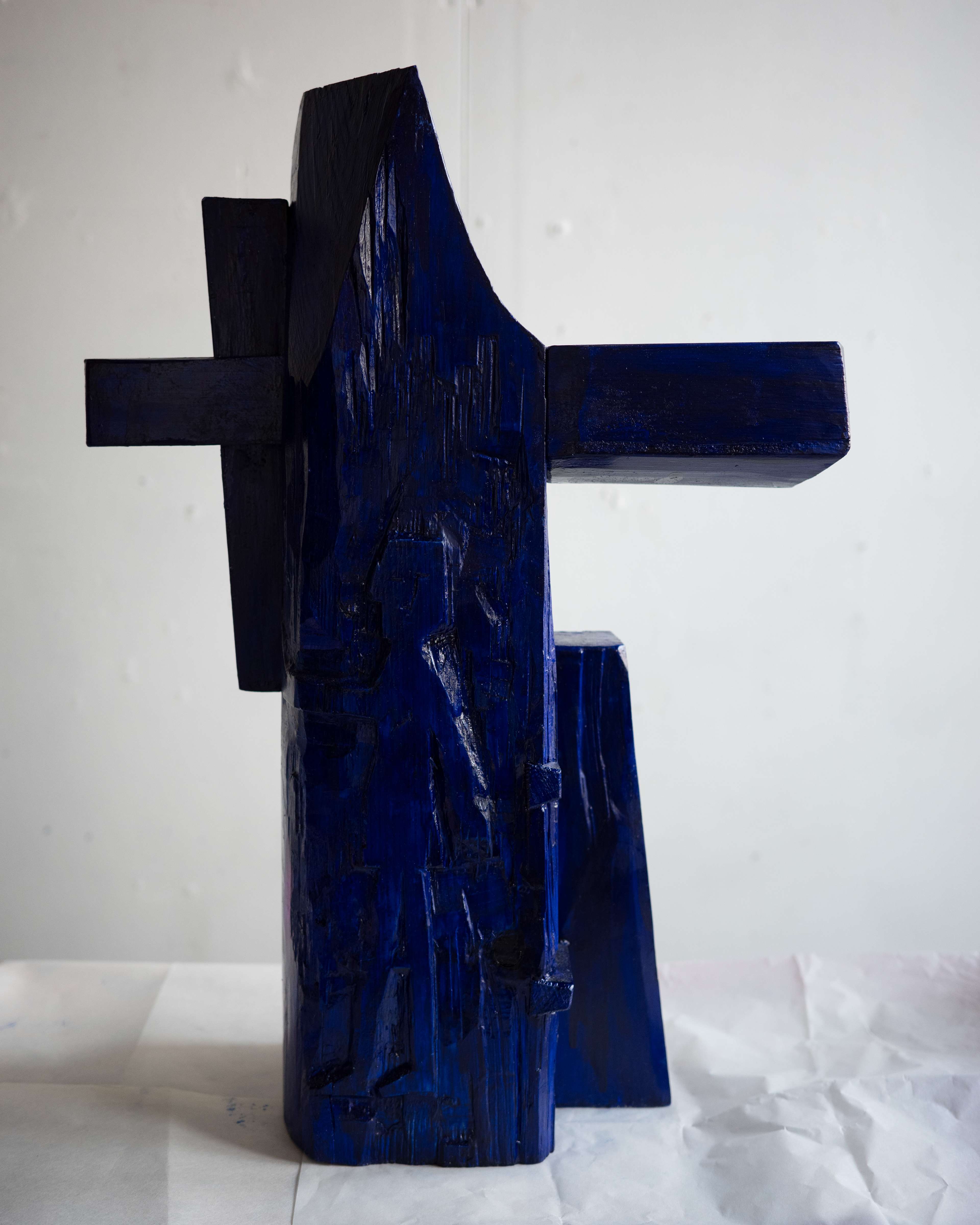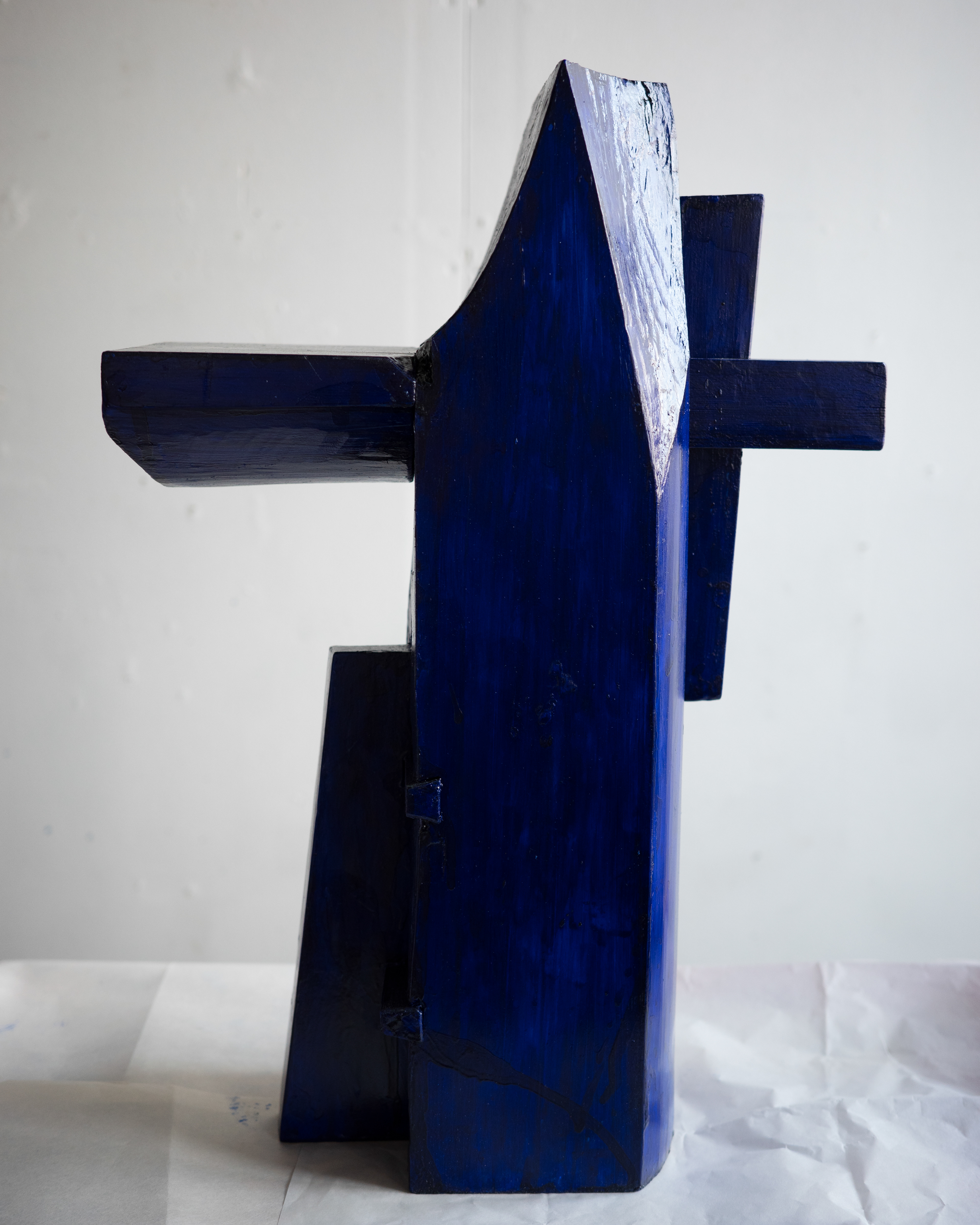In the artwork, the figure reaches for the wedge that holds the piece that pierces through frame and makes surface, a gesture that might cause the table to collapse. The piece is assembled from multiple parts, combining elements of traditional wooden craft with familiar notions of functional objects.